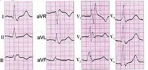 При блокаде правой ножки пучка Гиса и левой передней QRS расширен до 0,12 сек. и более, он имеет вид qR в отведениях I, aVL и форму rS в отведениях II, III, aVF. ЭОС отклонена влево. Широкий S в отведениях I, V5, V6 и r' или зазубрина на восходящем колене S III и высокий, широкий R' в V1. Комплекс QRS имеет вид rSR' или RSR' в V1. Конечная часть желудочкового комплекса изменяется только в тех отведениях, где есть R', то есть сегмент RS—T смещен вниз от изолинии и отрицательный Т в V1, aVR.