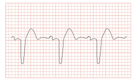 Q I, V6, RIII или rIII, rV1, в V1 часто регистрируется зазубрина — комплекс имеет вид rSR'. ЭОС отклонена вправо. Широкий S в I, V6, высокий и широкий R' в V1. Желудочковый комплекс имеет вид qRS с широким S в отведениях I, aVL, V6, возможно и в V4, V5 и форму rSR' или rR' в отведениях V1, III, реже в V2 и aVF. QRS расширен до 0,12 и более.