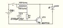 - Во втором случае (например ощутимо сопротивление первичной обмотки и/или эмиттера) (уменьшающийся) наклон тока уменьшается до момента, когда наведённого во вторичную обмотку напряжения уже будет недостаточно для того, чтобы держать ключ открытым.