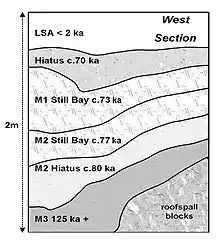 Для фазы M2 также характерны изделия из кости, в количестве более 20, но технология обработки камня заметно хуже. В фазе M3 артефакты из кости отсутствуют, а изделия из камня того же происхождения имеют сравнительно грубую отделку, нередко без ретуши. Большие куски охры с гравировкой присутствуют во всех слоях. В нижних слоях очаги очень большие и с многочисленными остатками моллюсков. Остатки костей животных, в количестве более тысячи, принадлежат множеству видов, среди которых рыбы, ластоногие, включая дельфинов, наземные млекопитающие, в основном грызуны, дамановые и мелкие полорогие, а также девять зубов человека, преимущественно молочных, но кости человека отсутствуют. Зубы принадлежали очень грацильным людям, останки которых находят в других регионах Южной Африки.