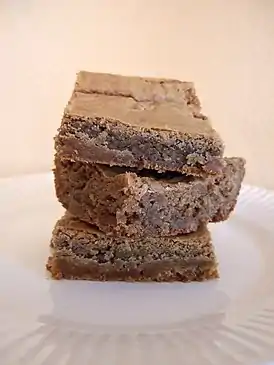 Блонди, также известный как блонди брауни или плитка блонди — это мягкий, сладкий американский десерт в виде прямоугольного куска.
