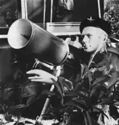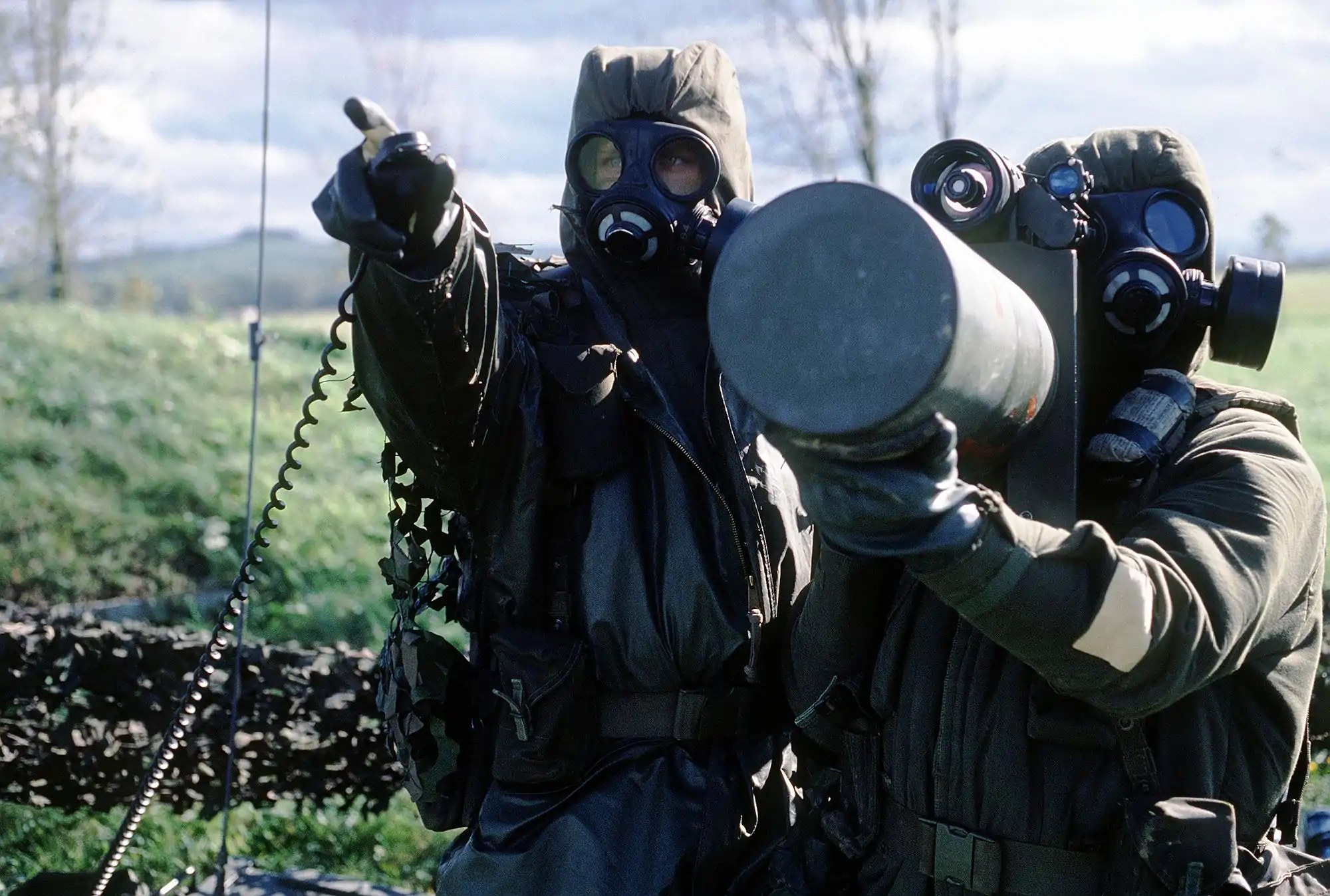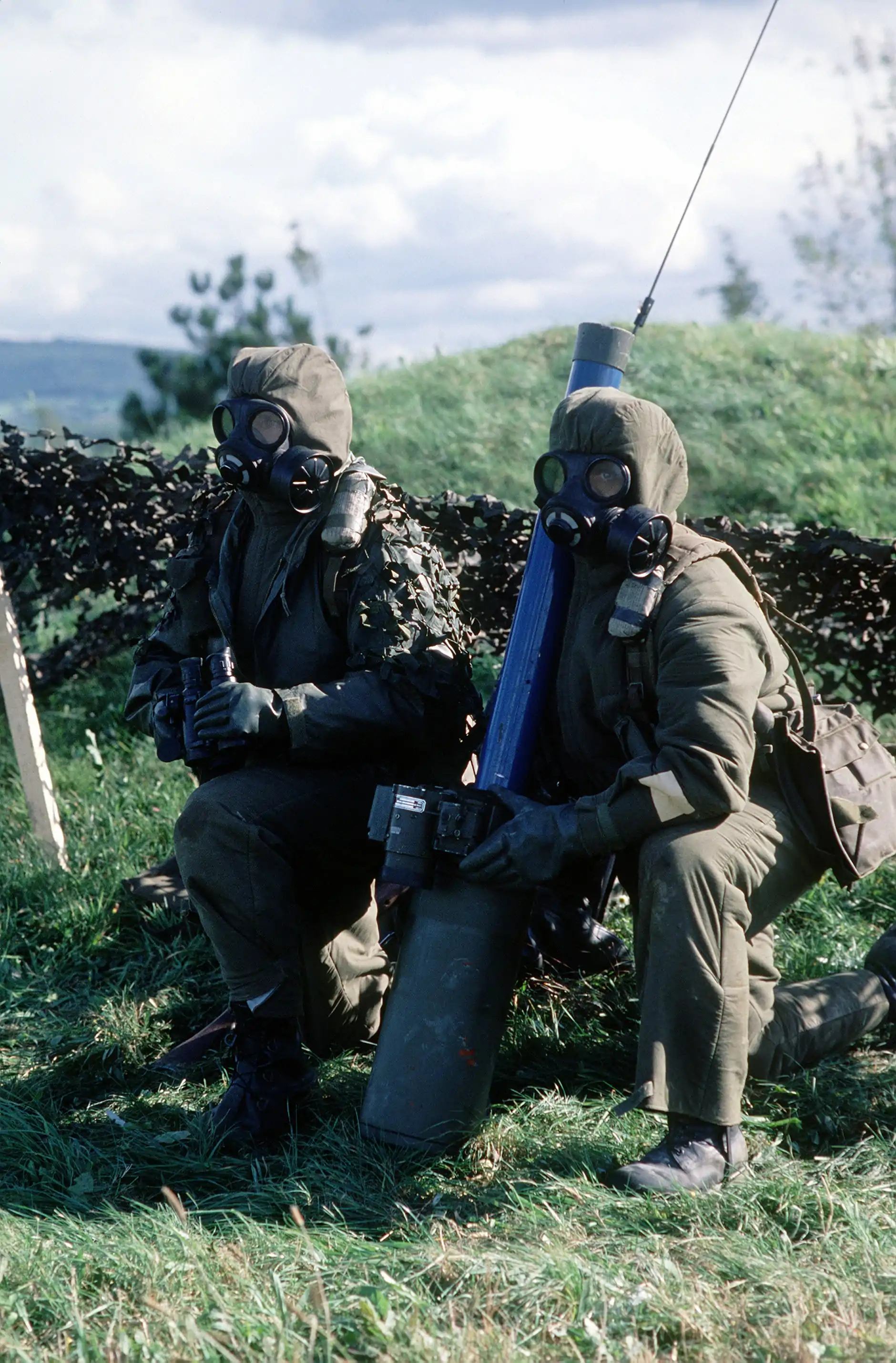 ![]() Стрелки 129-й канадской королевской зенитно-артиллерийской батареи в защитных костюмах, на позиции с ПЗРК «Блоупайп» во время учений НАТО «Корнет-фейзер» | |