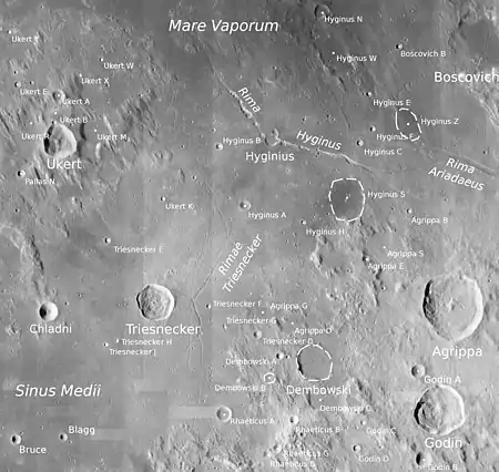 Кратер находится в Заливе Центральный (лат. Sinus Medii). Ближайшими соседями кратера являются кратер Брюс на западе; кратер Хладни на севере; кратер Триснеккер на северо-востоке и кратер Рэтик на востоке-юго-востоке[1].