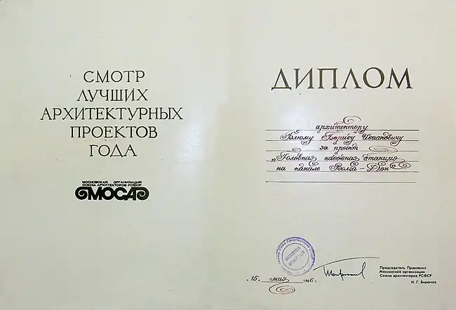 - Диплом Московского отделения СА СССР на смотре лучших архитектурных проектов года за проект Волго-Донской насосной станции — 1986 г.