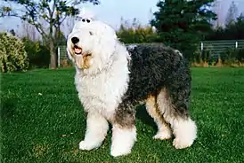 Бобтейл — крупная, крепкого телосложения собака с квадратным форматом корпуса и длинной, густой шерстью характерного для породы серо-белого окраса[3].