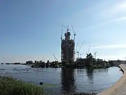 Река Бобылка в нижнем течении. На заднем плане — строящийся Лахта-центр | |