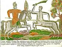 ![]() Бова-королевич. Роспись на крышке сундука. Великий Устюг, XVII век. | |