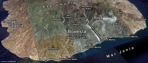 Сёла Калабрийской Греции: Бова и Бова-Марина (3870 жителей), Палицци и Palizzi Marina, Кондофури , Gallicianò и Amendolea, Роккафорте-дель-Греко , Рогуди и Roghudi Nuovo