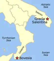 Карта расположения районов с греко-говорящим населением Grecia Salentina и Bovesia