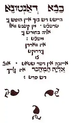 Известный литератор и поэт Элия Левита в 1507 году сделал адаптированный пересказ на идише написанного в стансах итальянского романа «Buovo d’Antona», бывшего в свою очередь переделкой английского «Sir Bevis of Hamton»[3]. Пересказ базировался на болонском издании 1497 года и явился первой адаптацией ottava rima на германском языке. О характере перевода Левиты можно судить по следующим начальным строфам: