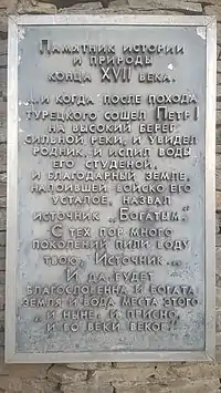 Согласно преданию, молодой государь Пётр Алексеевич, разъезжая по окрестностям с генералами и казачьями старшинами, наблюдал движение русских кораблей к верфи в устье Темерника. Заметив место, где из известнякового склона били родники, государь, утолив жажду из самого полноводного, воскликнул: «Богатый колодезь!».