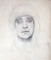 Ещё один рабочий рисунок головы Богородицы Врубель нарисовал на полулисте бумаги ватман «торшон» с обратной стороны акварели «Букет цветов»[3].