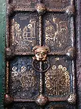 Западные и южные врата Рождественского собора в Суздале — выдающийся памятник русского прикладного искусства первой трети XIII века[6][7]. Врата состоят из деревянной основы, обитой медными листами, и украшены изображениями, выполненными в технике «огневого золочения». Западные врата содержат сцены христологического цикла и частично — богородичного, тогда как южные врата — в основном, деяния ангелов и в особенности архистратига Михаила[8][9].