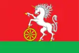 «В червлёном поле на зелёной оконечности восстающий серебряный единорог с золотыми глазами, рогом и копытами, ударяющий левым передним копытом в обод поставленного справа внизу золотого колеса».