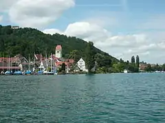 Вид на Бодман со стороны Боденского озера. На горе видно здание монастыря Фрауэнберг