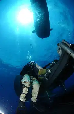 Водолазы-разведчики могут высаживаться из подводных лодок через торпедные аппараты на малом ходу или при нахождении их на грунте. При высадке диверсантов на ходу предварительно на поверхность воды выпускается специальный буй, соединённый с подводной лодкой буксировочным и направляющим тросом. Держась за него, пловцы всплывают и буксируются за буем на коротких штертах до выхода всей группы или подъёма на поверхность надувной лодки. Выход боевых пловцов из лежащей на грунте лодки производится с глубины 20—30 м при благоприятном рельефе дна. Кроме того, вместе с боевыми пловцами через торпедный аппарат обеспечивается выход буксировщиков. На подводных лодках США для буксировщиков устанавливаются специальные док-камеры (Dry Deck Shelter). ВМФ СССР и ВМФ России с 1990 по 1999 годы использовали сверхмалые подводные лодки проекта 865 «Пиранья», предназначенные, в частности, для доставки водолазов-разведчиков.