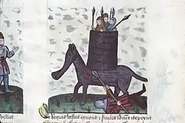 Об уязвимых местах боевых слонов говорит известное библейское предание, согласно которому Елеазар Маккавей в битве за Сионскую цитадель[17] проткнул копьем брюхо слона, на котором, как ему показалось, восседал сам сирийский царь, и погиб под рухнувшим на него слоном[18]. Клавдий Элиан писал о том, как римляне успешно применили свиней против боевых слонов Пирра, так как слоны, если не воспитывались рядом со свиньями, их визг не переносят[19].