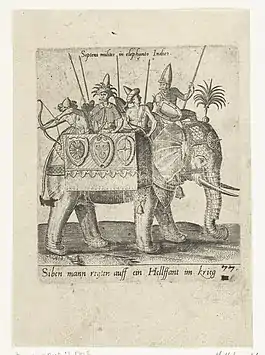 К VI веку до н. э. боевые слоны стали нести на себе до четырёх человек, ещё несколько солдат на земле защищали ноги животного. На спину слона крепился деревянный помост или плетённая корзина, где находилось трое стрелков, вооружённых дротиками или луками. Стенки корзины служили стрелкам защитой. На спинах слонов, возвышавшихся над полем боя, также устанавливались барабаны или сигнальные флаги для передачи команд солдатам[12].