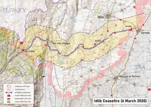 На переговорах 5 марта в Москве президентов России и Турции достигнута договорённость об установлении перемирия в зоне конфликта, с 0:00 часов того же дня; кроме того, создаётся коридор безопасности вокруг шоссе М4 Латакия — Алеппо глубиной в 6 км по обе стороны, а к 15 марта военные двух стран должны договориться о совместном российско-турецком патрулировании в этой зоне[62]. «Хайат Тахрир аш-Шам», которой там формально подчиняются отряды радикальных боевиков-иностранцев, московские договорённости и перемирие не признала и призвала к борьбе. Турецкая армия отводит своё вооружение и военную технику к северу от установленного коридора безопасности; на 11 марта уже отведена треть тяжёлого оружия (при этом, турки не будут выводить тяжёлое вооружение из своих наблюдательных пунктов[63]).