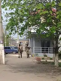 Вооружённые люди в камуфляжной форме у здания исполкома Славянска рассказали местным журналистам, что они и есть те самые «вежливые зелёные человечки», которых не так давно наблюдали по телевизору в Крыму. На вопрос об их национальности они ответили, что являются украинцами и прибыли в Славянск для «обеспечения светлого будущего горожан»[42].