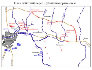 Арьергард под командованием генерал-майора Корфа должен был прикрывать отступление и затем также отступить кружным путём, следуя за 2-м пехотным корпусом. Авангард колонны Тучкова 1-го под командованием генерал-майора Тучкова 3-го, и состоящий из 3 пехотных и гусарского полков, был выслан на большую Московскую дорогу, чтобы сменить заслон из 2-й армии под командованием князя Горчакова, перекрывающий дорогу у села Валутино. Однако Горчаков, узнав о готовящейся переправе французов около Прудищевой, а также о приближении авангарда Тучкова 3-го, ушёл с позиции, оставив лишь отряд казаков Карпова. Тучков 3-й, достигнув большой Московской дороги, обнаружил, что такой важный пункт, как Лубинский перекрёсток, имеет слабое прикрытие. Тучков 3-й занял начальную позицию за рекой Колодней и выслал вперёд небольшой отряд.