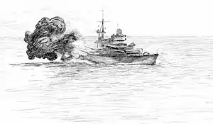![]() Линкор «Конте ди Кавур» ведёт огонь из кормовых орудий главного калибра | |||