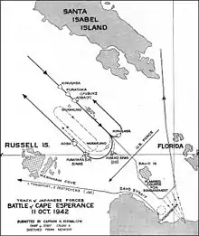 - Cook, Cape Esperance, с. 16 и 19-20; Frank, Guadalcanal, с. 295—297; Morison, Struggle for Guadalcanal, с. 148—149 и Dull, Imperial Japanese Navy, с. 225. Пока не все корабли TF64 были в распоряжении Скотта, соединение носило индекс TF64.2. Американские эсминцы из 12-го эскадрона, командир капитан Роберт Г. Тобин на Фаренхолт.