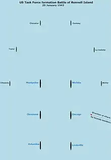 Кроме защиты конвоя, перед TF18 стояла задача встретиться с четырьмя американскими эсминцами, расположенными у Тулаги, в 21:00 29 января для того, чтобы провести зачистку пролива Слот к северу от Гуадалканала на следующий день, чтобы прикрыть высадку десанта с транспортов на Гуадалканал.[3] Однако эскортные авианосцы под командованием командора Бена Уятта были слишком медленными (18 узлов), что не давало возможности Гиффену прибыть по расписанию, поэтому Гиффен оставил авианосцы под прикрытием двух эсминцев и в 14:00 ушёл, повысив скорость до 24 узлов (44 км/ч).[20] Опасаясь угрозы со стороны подводных лодок, которые разведка союзников обнаруживала в этой зоне, Гиффен построил свои крейсера и эсминцы в противолодочный строй, не ожидая атаки с воздуха. Крейсера были построены в две колонны, которые разделяло 2 500 ярдов (2 300 м). Уичита, Чикаго и Луисвилль составили правую колонну, а Монпелье, Кливленд и Колумбия левую. Шесть эсминцев были расположены полукругом радиусом 3 км (2 мили) перед колоннами крейсеров.[3]