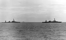 ![]() Чикаго погрузившийся в воду утром 30 января 1943 в результате повреждений от торпеды, полученных предыдущей ночью | |||