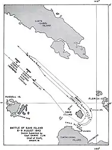 Обманув Союзников ложным манёвром на юго-восток, Микава повёл своё соединение севернее острова Бука, и, пройдя вдоль восточного побережья острова Бугенвиль, направился в пролив Слот. Утром 8 августа японское соединение на 6 часов остановилось мористее городка Кьета на Бугенвиле, чтобы подойти к Гуадалканалу в ночное время, избежать обнаружения и последующих воздушных атак[18]. Здесь Микава приказал увеличить интервалы между своими кораблями, надеясь таким образом скрыть состав своего соединения. Он отправил четыре корабельных гидросамолёта (три Aichi E13A и один Kawanishi E7K2) на разведку в район Гуадалканала. Один E13A был сбит истребителем с авианосца Уосп, его экипаж погиб[22].