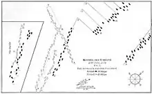 В свою очередь д'Орвилье, видя беспорядок, в который после всех маневров пришли британцы, решил использовать момент. Его флот шел довольно стройной колонной, и в 1 час пополудни он скомандовал поворот последовательно, с намерением пройти британцев с подветра.[9] При этом французы могли ввести в бой все пушки наветренного, т.е. высокого борта. На другом борту нижние порты приходилось держать закрытыми. Но головной корабль не увидел сигнала, и только де Шартр, четвертый от начала, отрепетовал и начал поворот (2., поз. F).[21][11] Проходя мимо флагмана он голосом уточнил его намерение. Но из-за ошибки головного корабля удобный момент был упущен.[19]
