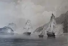 Оригинальный текст (англ.)[показатьскрыть]Hearing the firing I took a small fast pulling [rowing] gig and went round a point of land with my long spy glass to see the fun, while many ships sent their armed boats, & the frigate got underway to protect them, it was quite a farce - I kept a mile off not intending to mix up in this quarrel.— [25]
