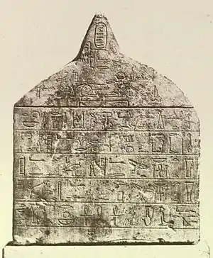 ![]() Памятная стела о кончине быка Аписа прошедшей в 6-й год правления фараона Бакенренефа | |
