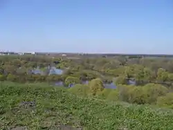 Вид на устье Болвы с Чашина Кургана. Вдали виден автомобильный мост через Болву. | |