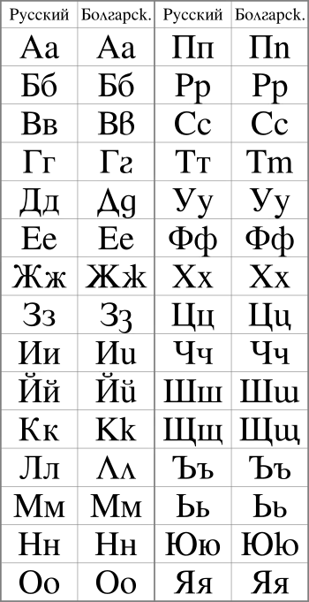 Отличия в форме символов «болгарицы» (справа) от русской кириллицы