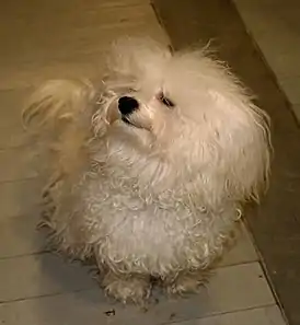 Очень эффектный вид придают ей черные глаза, веки, губы и мочка носа. Переход от выпуклого лба к короткой морде четко обозначен. Шерсть густая, шелковистая, в свободных завитках, с подшерстком. Хвост покрыт длинной, струящейся шерстью, посажен высоко, лежит на спине. Шерсть собаке подстригают ножницами, открывая её глаза и придавая округлую форму голове и туловищу. Правильно расчесанная и подстриженная собака имеет вид пуховки для пудры.