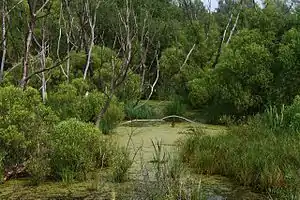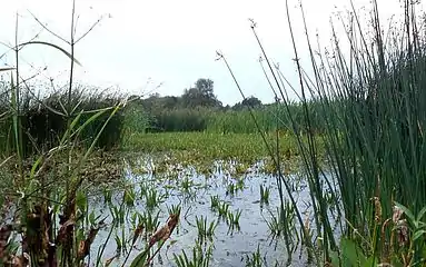 - Низинные (эвтрофные) — тип болот с богатым водно-минеральным питанием, в основном за счёт грунтовых вод. Расположены в поймах рек, по берегам озёр, в местах выхода ключей, в низких местах. Характерная растительность — ольха, берёза, осока, тростник, рогоз, зелёные мхи. В районах с умеренным климатом — это часто лесные (с берёзой и ольхой) или травяные (с осоками, тростником, рогозом) болота. Травяные болота в дельтах Волги, Кубани, Дона, Дуная, Днепра называют плавнями, сочетаясь с протоками, озёрами, лиманами, ериками и др. микроводоёмами первичной и вторичной дельты. В низовьях рек пустынных и полупустынных регионов (Или, Сырдарья, Амударья, Тарим и др.) заболоченные участки и их растительность называется тугаи.