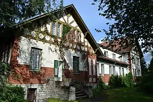 Двухэтажный лечебный корпус для спокойных больных мужского пола. Имеет основной план в виде буквы L и высокую красную каменную крышу. Здание в хайматстиле имеет вид большой виллы. Оформление фасадов асимметрично согласно югенд-стилю. На цоколе из плитняка до окон возведён горизонтальный пояс из красного камня. Окна с вертикальным решением, использовано множество различных размещений оконных рам. Светлая штукатурка внешних стен прерывается вертикальными полосами из красного кирпича. Главный вход ведёт под углубляющуюся арку в стене. Арочный мотив также образуют расположенные над главным входом окна второго этажа, выходящие на лестницу. На фронтонах псевдорешётка. Сохранились окна со скрытыми решётками и плотным расположением рам, во внутренних помещениях — двери в югенд-стиле, дверные ручки, каменный паркет, настенные панели[11];