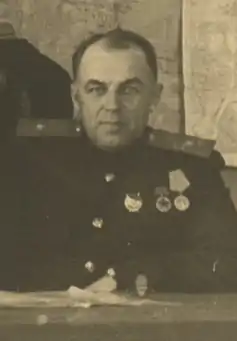 ![]() Руководитель контрбатарейной борьбы береговой артиллерии КБФ генерал-майор береговой службы А.И. Большаков. Ленинград, июнь 1943 года | |