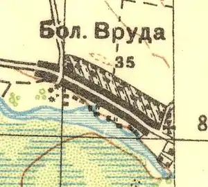 Согласно топографической карте 1930 года Большая Вруда насчитывала 35 дворов и церковь[23].
