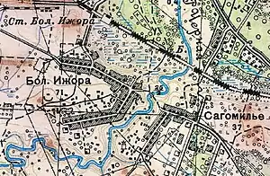 - Согласно топографической карте 1939 года село Большая Ижора насчитывало 71 двор, деревня Сагомилье — 37 дворов. 27 августа 1939 село Большая Ижора было отнесено к категории посёлков городского типа.