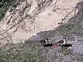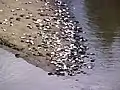 Раковины пресноводных двустворчатых моллюсков — перловиц на песчаной косе посреди реки