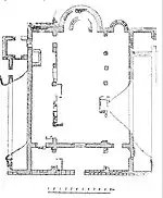 продольные части. Якобсон предполагал, что колонны изначально были мраморными, которые при перестройках заменили на изготовленные из местного известняка, что подтверждается последующими раскопками: были найдены мраморные коринфские капители и твёрдо установлено, что в в архитектурном оформлении использовался проконнесский мрамор[7]. Центральный и южный нефы заканчивались трёхгранными апсидами. Стены были выложены в два ряда, «в перевязь», из крупных тёсаных блоков (квадров, средний размер 1,14 на 0,42—0,46 на 0,17—0,30 м), с узкой забутовкой между ними, заполненной небольшим слоем мелкого бутового камня и щебня, залитого известковым раствором с примесью толчёного кирпича и черепицы[11] толщина стен около 0,95—0,97 м — примерно, три византийских фута — распространенный ранневизантийский строительный стандарт (римская система кладки)[7]. При перестройке храм восстанавливался по первоначальному плану и вторично (иногда с подтёской) использовались камни из прежней кладки, но уже без соблюдения строгих строительных норм. Предполагается, что здание имело деревянную крышу и большое количество окон[7].