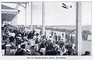 Спонсорами Большой недели авиации, состоявшейся в период с 22 августа по 29 августа 1909 года, были многие ведущие производители шампанского, включая Moët et Chandon и Mumm[1], и мероприятие организовано было комитетом, возглавляемым маркизом де Полиньяком. Это было первое международное публичное лётное событие, которое рассматривалось как в то время[2], так и более поздними историками[3] как знаменующее наступление эры тяжёлой воздушной авиации. В нём приняли участие почти все выдающиеся авиаторы того времени, и среди 500 000[4] посетителей были Арман Фальер, президент Французской Республики и британский канцлер казначейства Дэвид Ллойд Джордж. Неделя проводилась на равнине в Бетени, примерно в 5 км (3 мили) к северу от Реймса, которая впоследствии стала авиабазой Реймс — Шампань. Для этого мероприятия была построена большая трибуна, а также ряд навесов для размещения самолёта. Рядом с трибуной был «Популярный корпус», в комплекте с огромным табло. Удобства для зрителей включали в себя ресторан, который мог вместить 600 человек[5], участок специально уложенного газона с эстрадами и клумбами, а также почтовое отделение, из которого ежедневно отправлялось 50 000 открыток и почти миллион слов был использован журналистами.[6] Зона для зрителей находилась всего в нескольких сотнях метров от железнодорожной линии Лаон-Реймс, и была создана временная станция.[7]