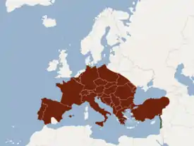 Лесная зона от Западной Европы (включая Англию) до запада Белоруссии, Молдавии и юго-запада Украины.