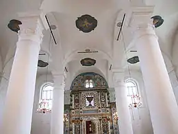 Колонны стоят на высоких цоколях, их базы состоят из двух валиков, а ниже стилизованной ионической капители с восемью волютами размещается астрагал. Над капителями колонн — трёхчленные импосты. Между колоннами когда-то находилась бима на два входа в окружении балюстрады. В 2004 году выполнена реконструкция бимы на основании предвоенных фотографий, кроме того она не является постоянной составляющей интерьера. Оконные проёмы обрамляют рельефные верёвки.