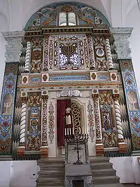 От стороны фасада, на обе стороны здания, находятся два отдельных, достроенных в второй половине XIX века, этажных альков в проекции квадрата 5,9 × 5,7 м, на фундаменте, поддерживаемые аркадами и накрыты отдельной крышей. Арки опираются на подогнанные к столбам аркады (тосканские полуколонны). Второй ярус альковов расчленён пилястрами и увенчан карнизом. Фасад главного зала от востока идентичен фасаду от севера и юга. Центральная часть имеет пивные (размеры: 6 × 5,25 × 2,35 м). Во времена функционирования религиозной общины использовались генизы.