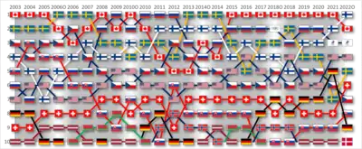 - Итоговые места учитывают положение сборных Северной Америки и Европы: без их учёта сборная Швеции занимает 2-е место, сборная России — 3-е место, сборная Чехии — 4-е место, сборная США — 5-е место и сборная Финляндии — 6-е место.