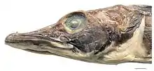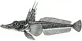 Первый спинной плавник высокий, его высота содержится 3,0—3,8 раза в стандартной длине рыбы, более или менее треугольный по форме (не трапециевидный), с очень низкой плавниковой складкой, достигающей по высоте уровня не выше 3/4 длины наибольших колючих лучей. Первый и второй спинные плавники разделены широким междорсальным промежутком. Межглазничное пространство умеренной ширины (17—20 % длины головы), вогнутое или относительно плоское, обычно несколько меньше или равно диаметру орбиты. Глаз большой, диаметр орбиты составляет 19—21 % длины головы или 42—46 % длины рыла. Внешние края лобных костей умеренно подняты над орбитой. Задний край челюстной кости простирается назад до вертикали, проходящей через переднюю треть или середину орбиты.