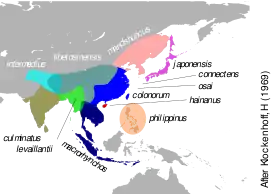 Распространена в Южной, Юго-Восточной и Восточной Азии (от Паропамиза к востоку до побережий Охотского, Японского, Желтого, Восточно-Китайского и Южно-Китайского морей), на Дальнем Востоке России (в Приамурье и Приморье[2], на Сахалине и Южных Курильских островах к северу до Урупа). Так же занимает острова: Шри-Ланка, Андаманские, Большие Зондские, Малые Зондские, Филиппины, Хайнань, Тайвань, Рюкю, Цусима, Хоккайдо, Хонсю, Сикоку, Кюсю, Садо, Оки, Идзу, Танегасима, Якусима, Огасавара, Чеджудо.